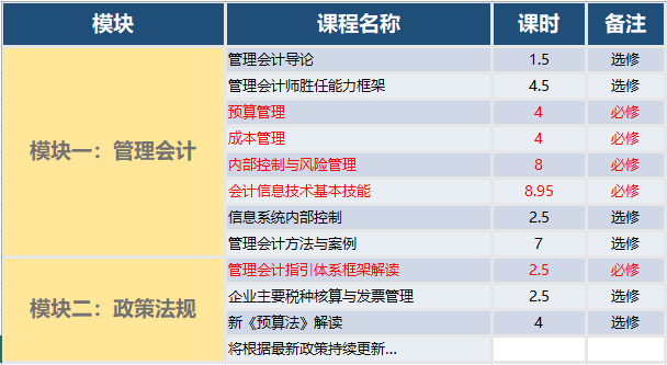 初级管理会计师CNMA一共有五门必修课,覆盖了《预算管理》、《成本管理》、《内部控制与风险管理》、《管理会计胜任能力框架解读》和《会计信息技术基本技能》,对于融汇贯通管理会计岗位的基本要求还是没有问题的,选修课程可以开阔学生的视野。取证后能进入全国管理会计人才库,成为中国的管理会计人才。表格整理:初级管理会计师CNMA项目运营办公室。